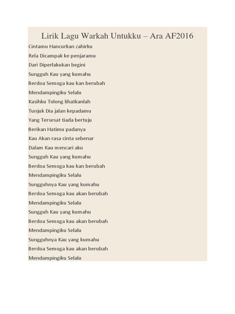 Download View Lirik Warkah Untukku as PDF for free. Ara AF2016 Lirik Warkah Untukku - Ara AF2016 Lirik Warkah Untukku - Ara AF2016 Lirik Warkah Untukku - Ara AF2016 Cintamu hancurkan zahirku Rela dicampak ke penjaramu Dari diperlakukan sebegini Sungguh kau yang ku mahu Berdoa semoga kau akan berubah Mendampingiku selalu. The duration of the song is 344.